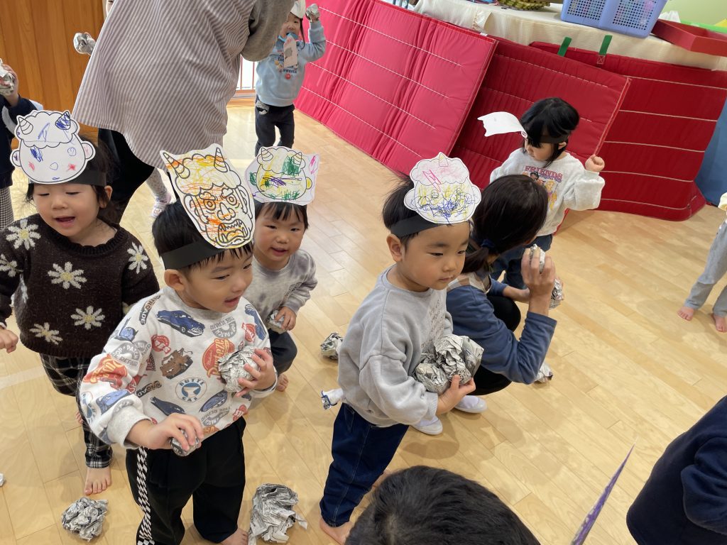 ドキドキしながらも新聞ボールを「えい!」「おにはそと!」投げました!