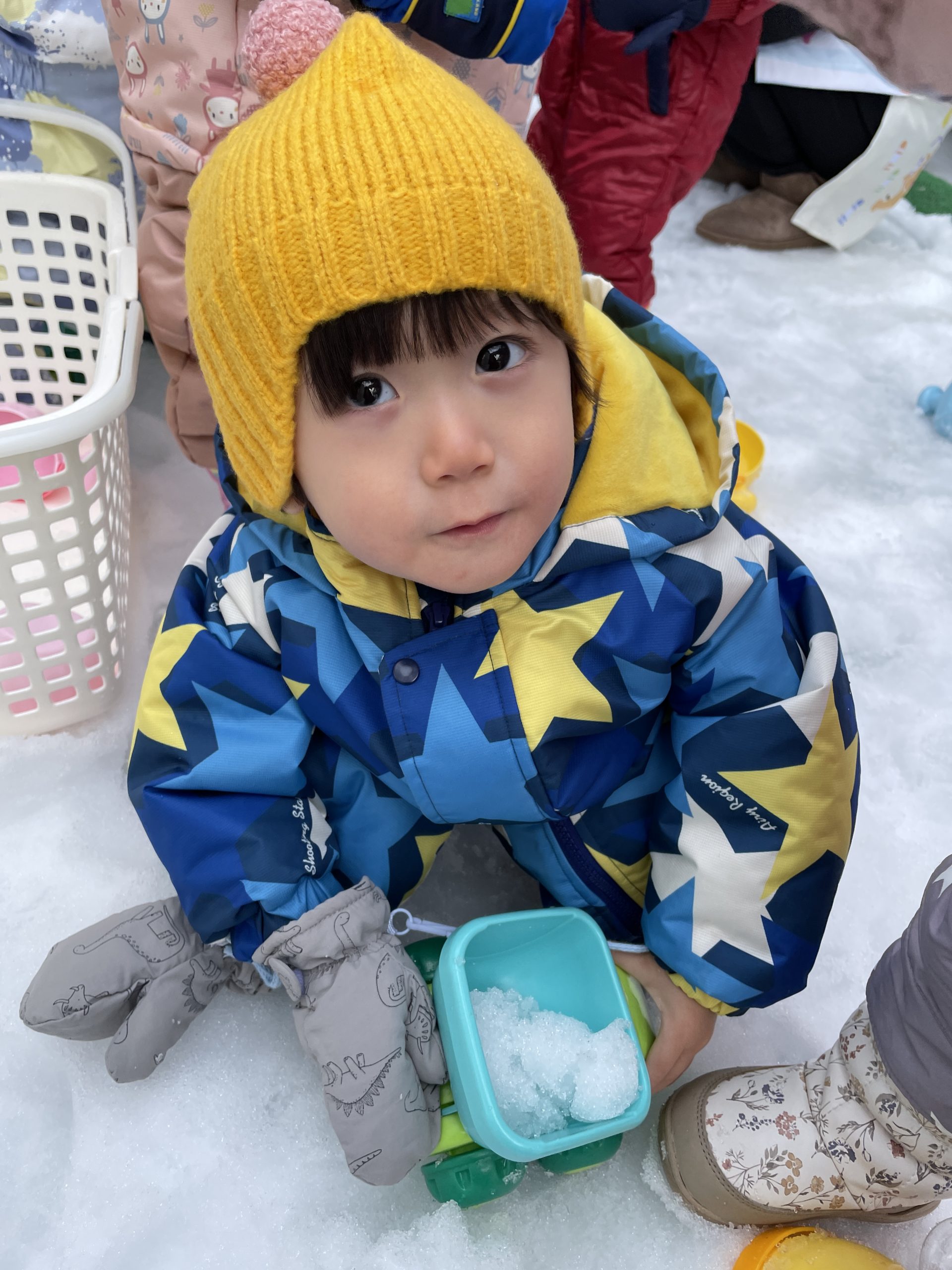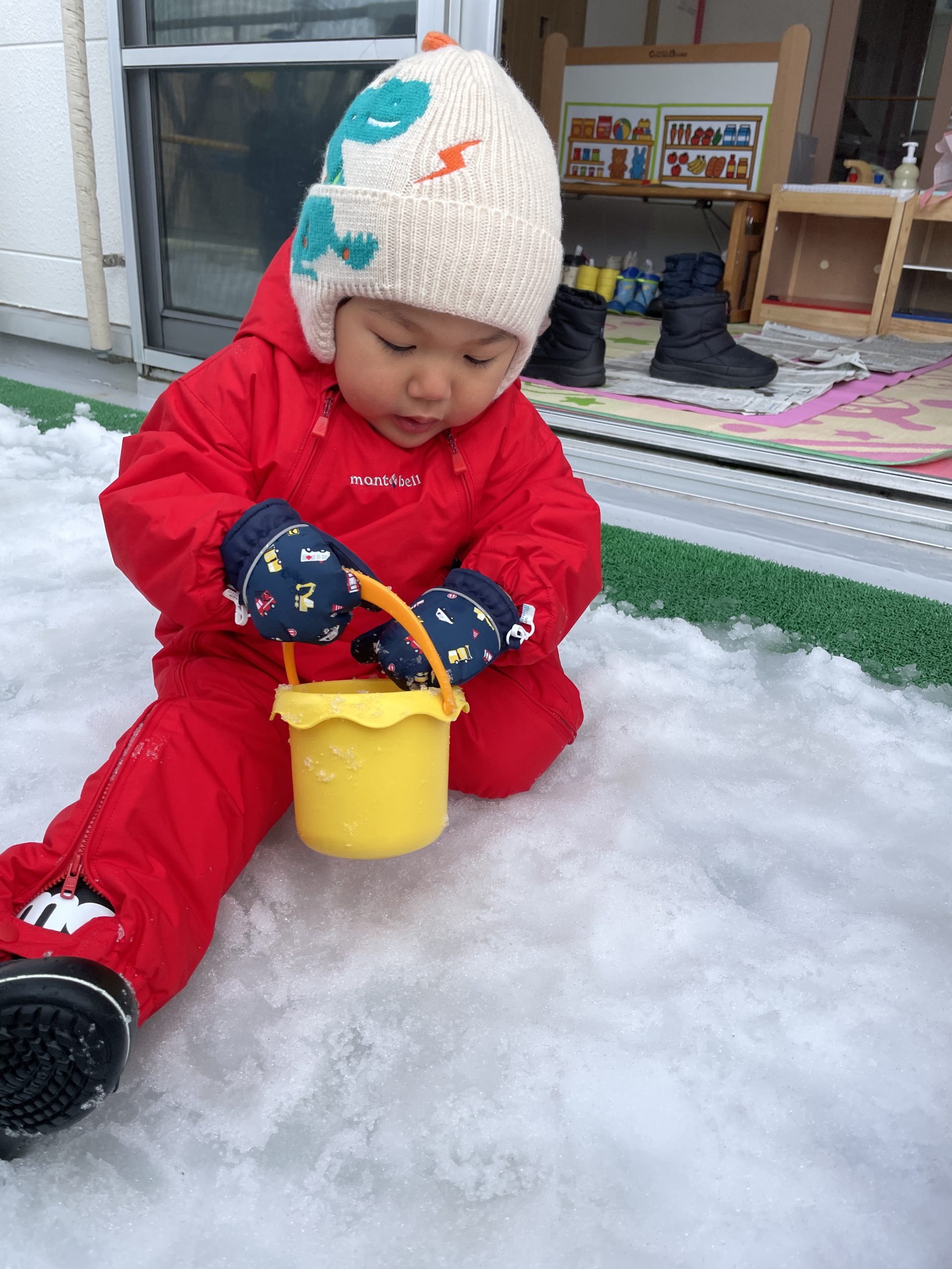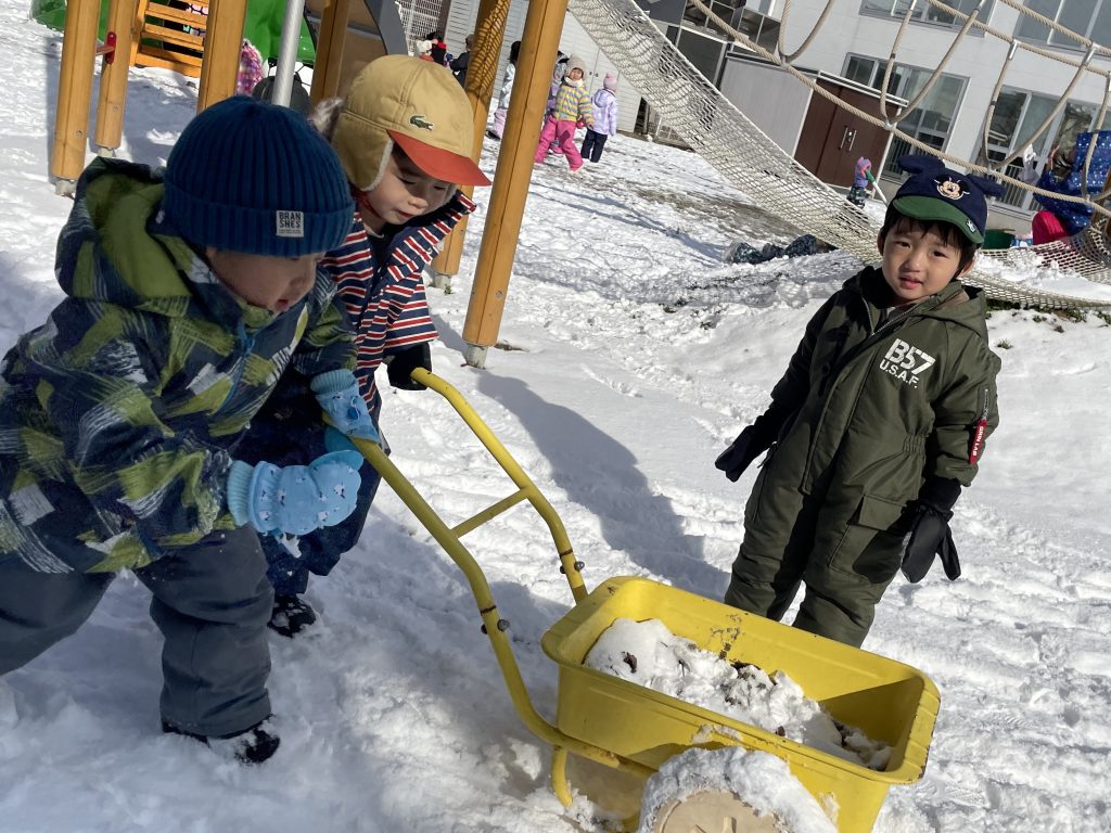 さくらんぼさんは園庭で!力を合わせて雪を運んでいました!