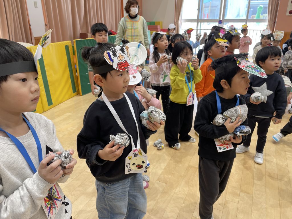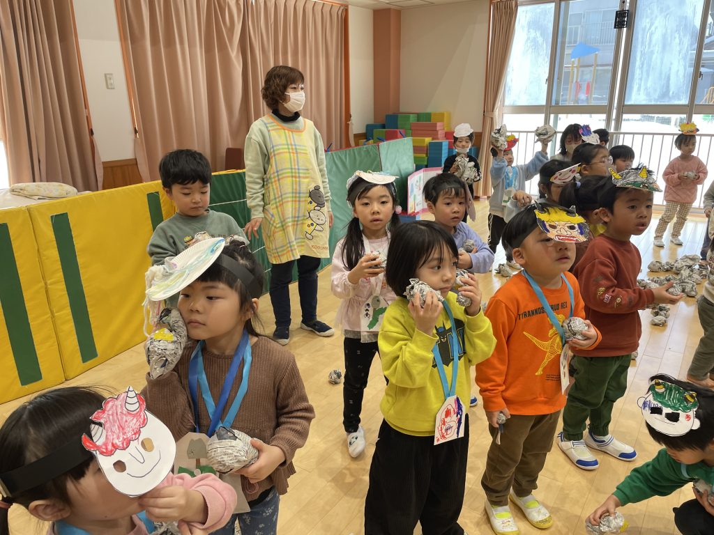 大きいクラスのお友だちは鬼に向かって新聞ボール(豆)を投げます!